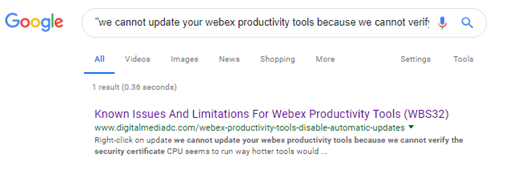 I’ve been getting this error when trying to accept autoupdate prompts from the WebEx Outlook plugin: