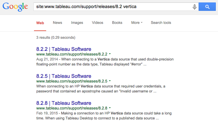 But, what if you don’t know when an issue was fixed, and you don’t want to have to search a whole bunch of individual release note pages? Then, you can use Google’s site search feature, and specify the following site base: